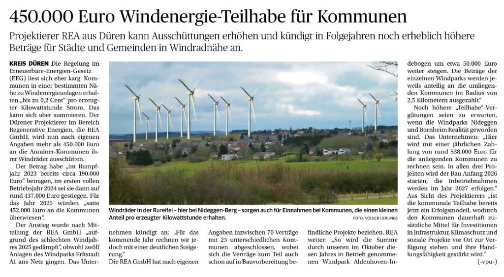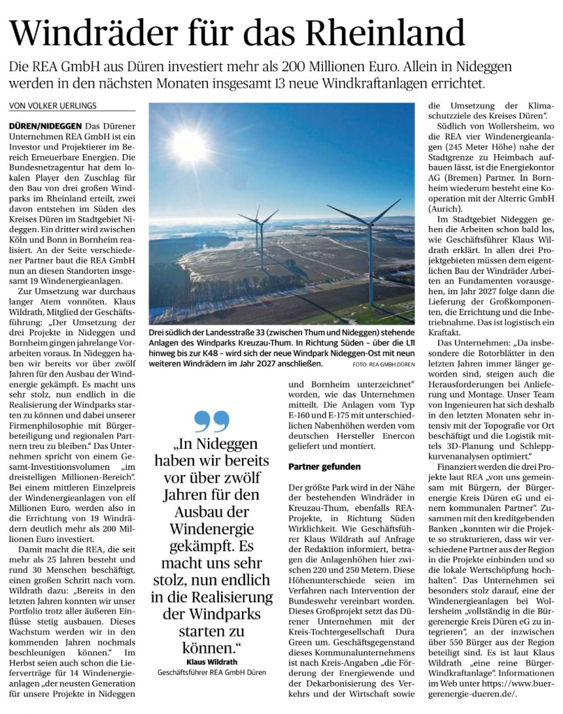 In der vergangenen Woche wurden drei Presseartikel über unsere derzeitigen Projekte und damit verbundenen Erfolge veröffentlicht. Sowohl im Bericht der Aachener – Zeitung und im Newsletter des Gigawattparks liegt der Fokus auf dem Bau der drei neuen Windparks mit insgesamt 19 modernen Windenergieanlagen, die einen wichtigen Beitrag zur nachhaltigen Energieversorgung in der Region leisten werden. Mit einer Gesamtinvestition im dreistelligen Millionenbereich zählen diese Projekte zu unseren größten Vorhaben in den vergangenen Jahren, wobei die Wertschöpfung bewusst in der Region verbleibt.
